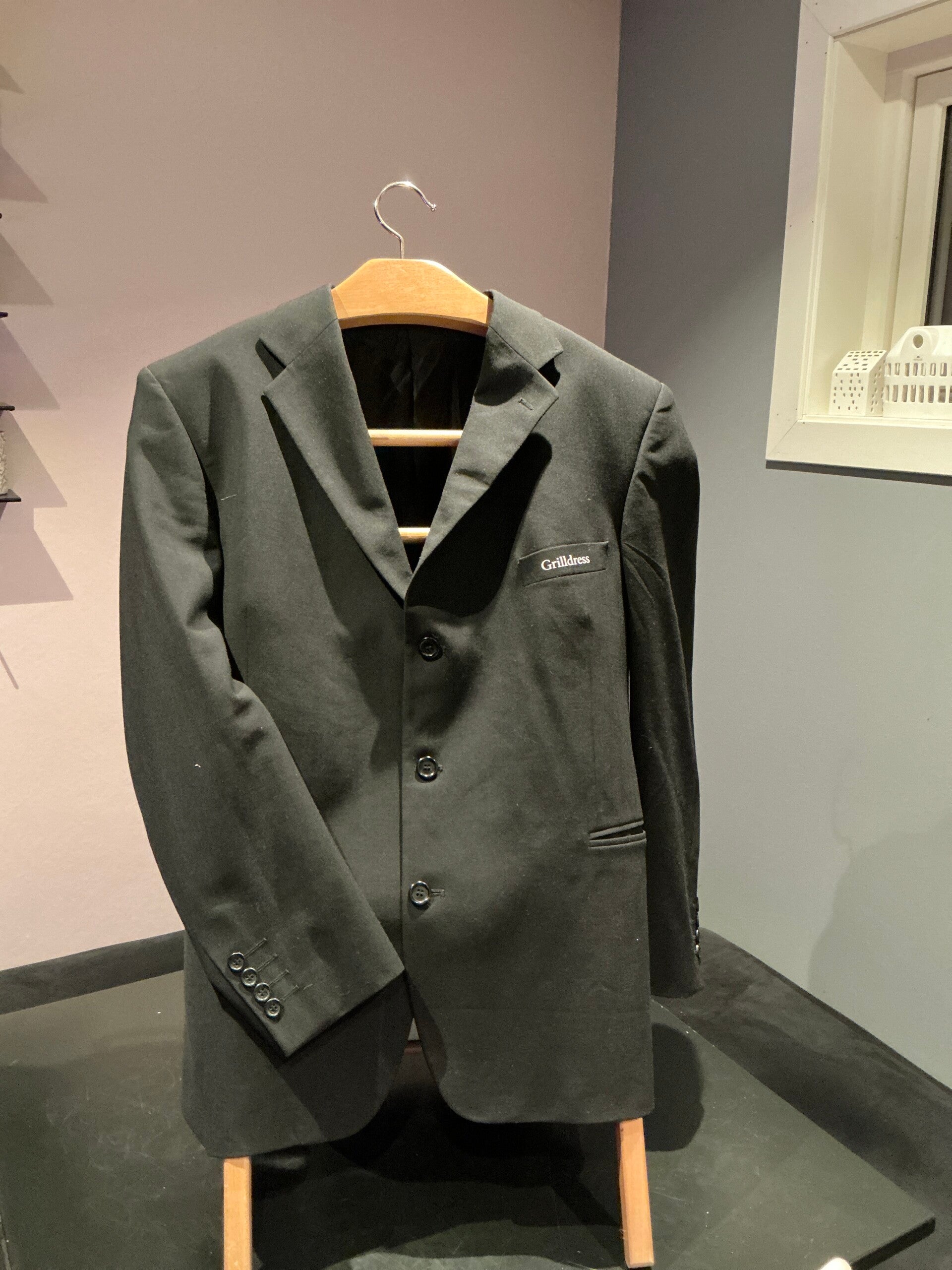 Kongen av campingplassen? Dressjakka er kjøpt brukt men er veldig fin likevel. Denne er en D 104 (Large) Merke: Batistini. Sort, herre.