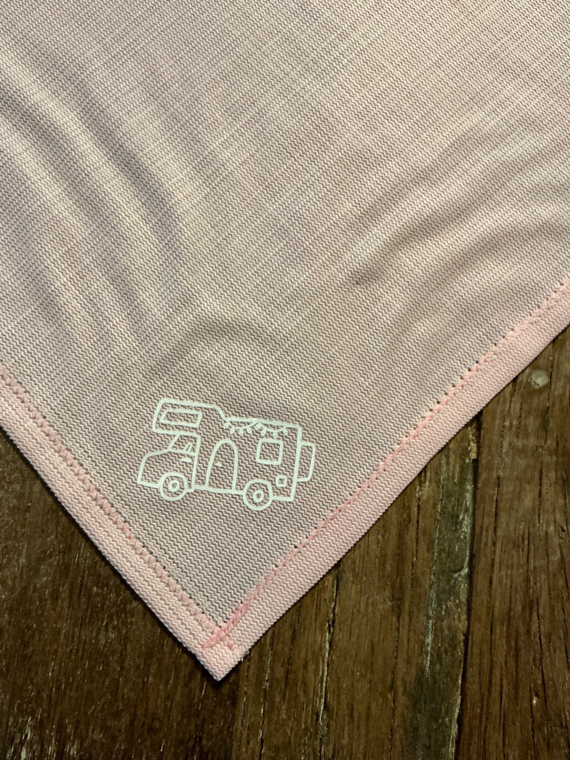 Liten søt duk i rosa, ganske tynt stoff (usikker på materialet). Vi har trykket en bobil i det ene hjørnet. Duken er 32 x 34 cm.